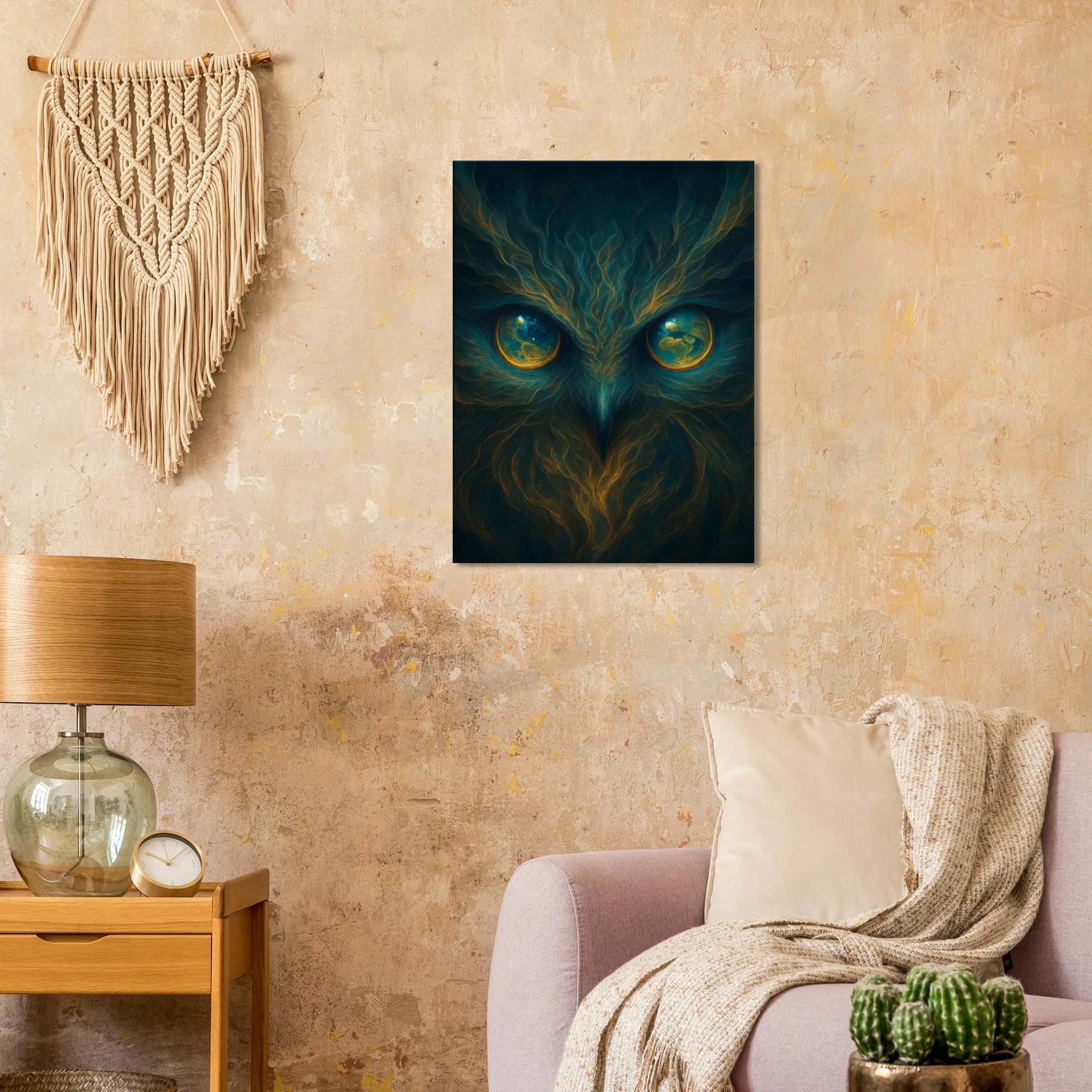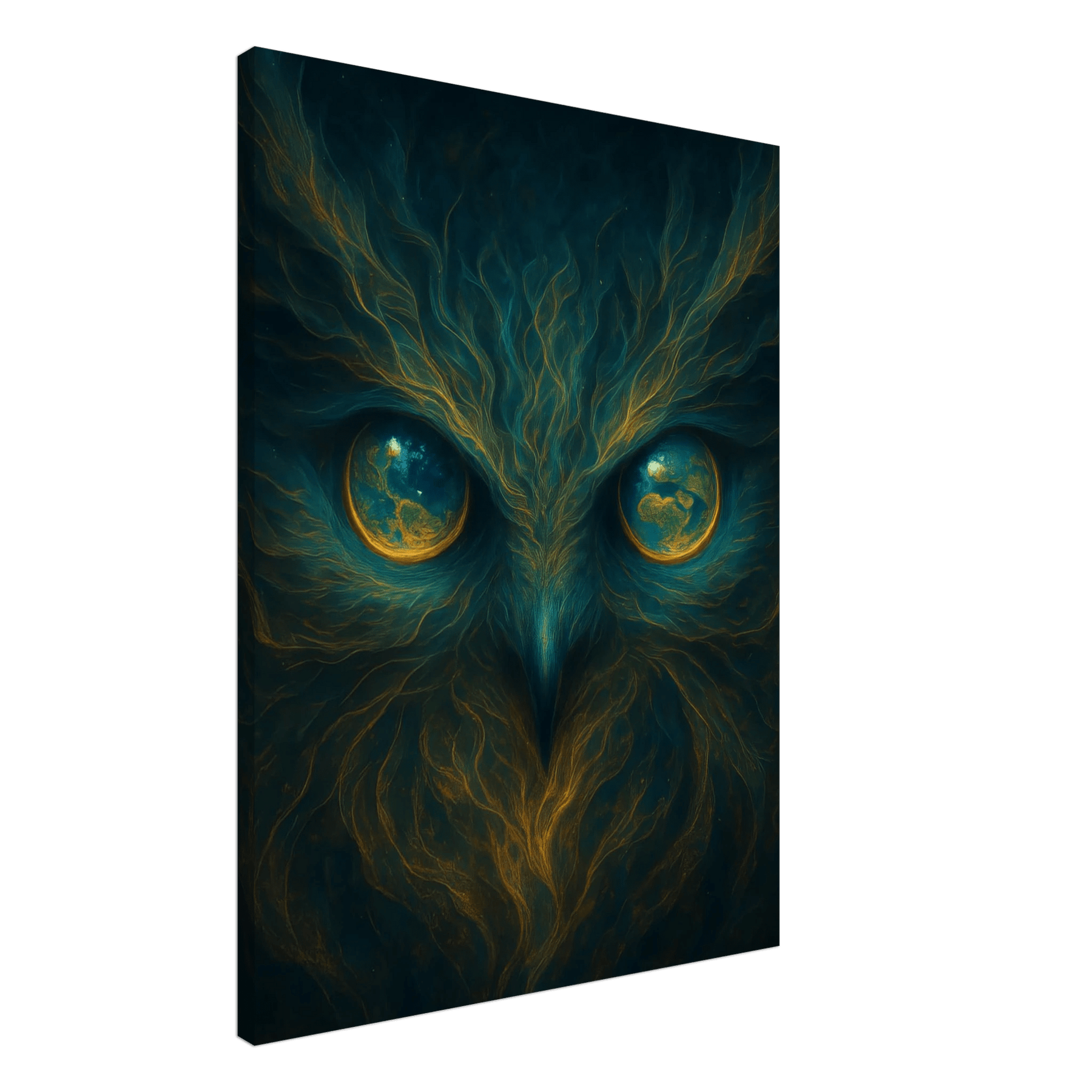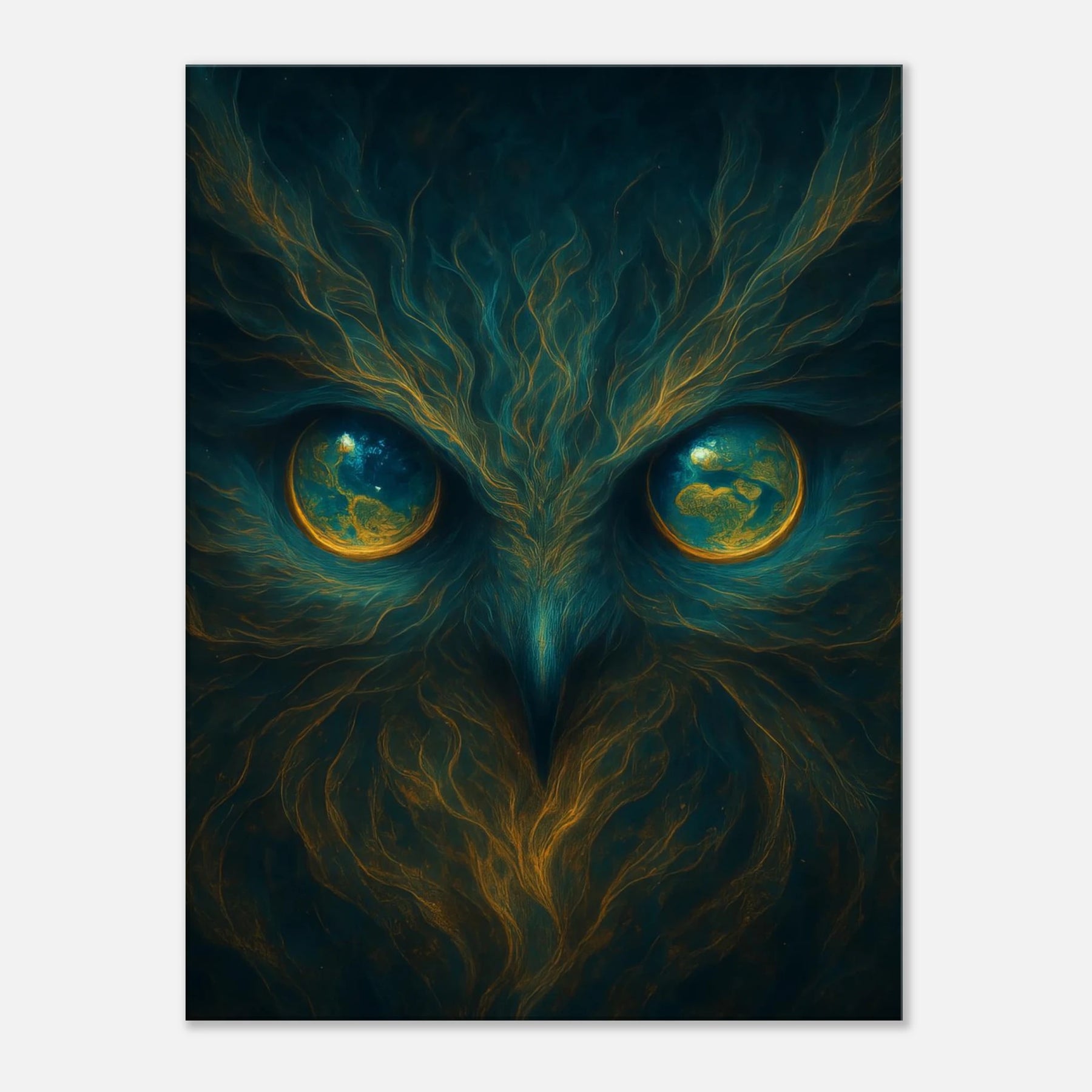 Sie sieht dich – tief, still, wissend. Eyes of Gaia ist mehr als ein Kunstwerk. Es ist ein Bewusstsein, das dich anschaut. Eine uralte Weisheit, eingefangen in leuchtenden Augen, die zugleich Eulenaugen und Weltkugeln sind. Wie eine Göttin aus Sternenstaub offenbart Gaia ihre Präsenz: mystisch, beschützend, allwissend.