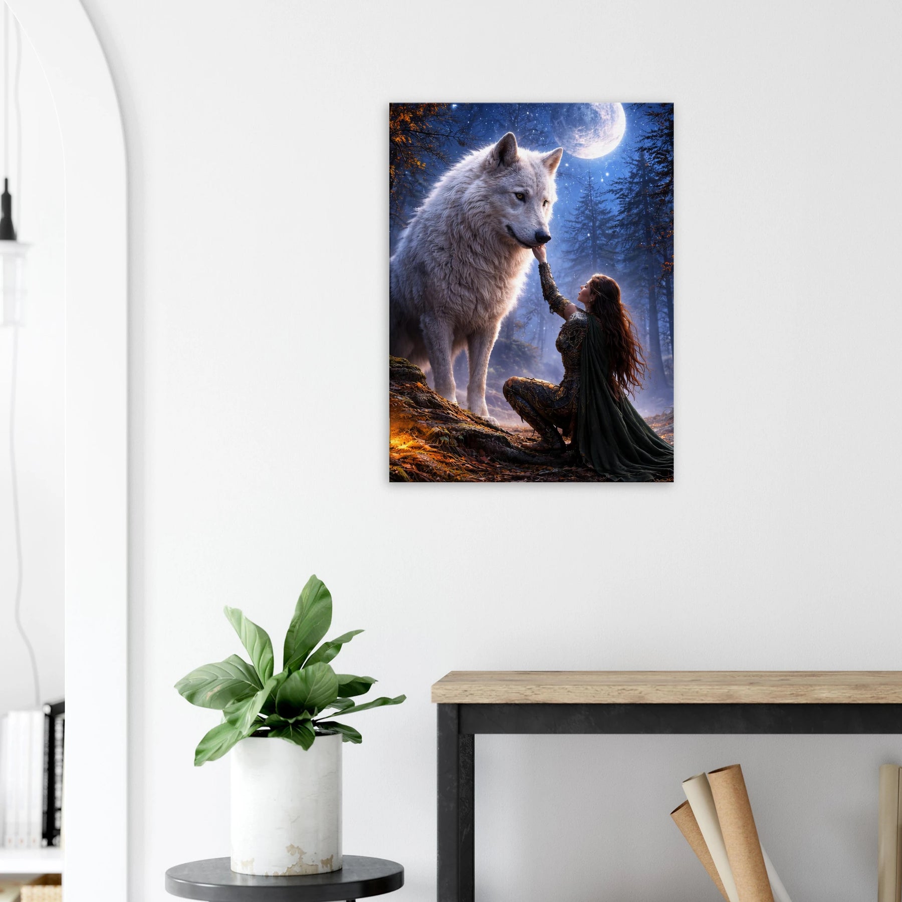 In Moonbound Reverence verschmelzen zwei Welten zu einem einzigen, magischen Moment. Unter dem silbernen Licht des Mondes begegnen sich Mensch und Tier – nicht als Fremde, sondern als Seelen, die sich erkennen. Der Blick des majestätischen Wolfs ist ruhig, kraftvoll, voller uralter Weisheit. Die Berührung ist sanft… und doch trägt sie eine Tiefe, die man kaum in Worte fassen kann.