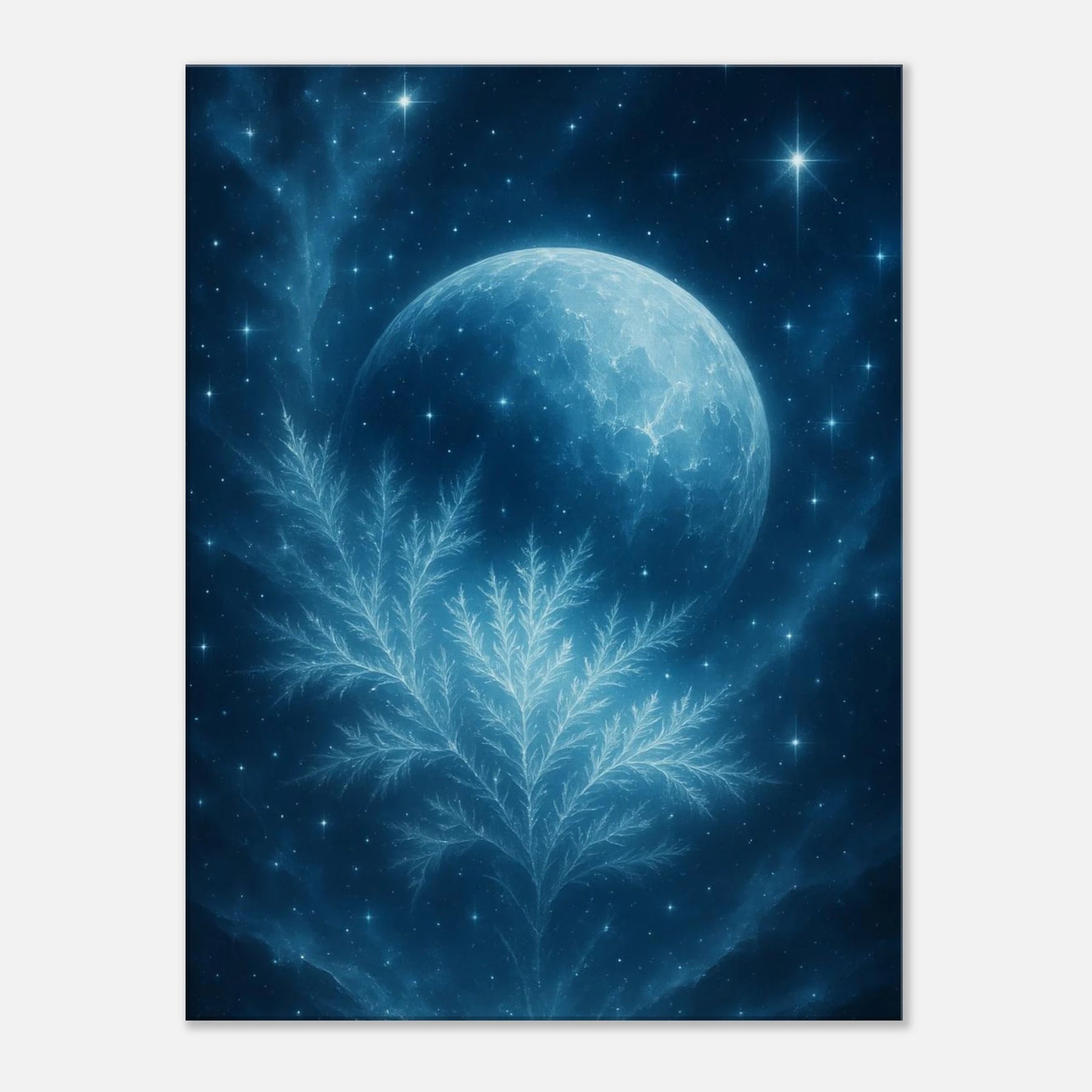 Stellar Winter ist ein stilles Wunder zwischen Himmel und Herz. Der Mond thront majestätisch über einem ätherischen Eisbaum, der wie aus Sternenlicht gewachsen scheint – verwurzelt im Nichts, genährt vom Zauber der Nacht. Dieses Bild berührt nicht durch Lautstärke, sondern durch Tiefe. Es flüstert von kosmischer Ruhe, von Sternenfrost und von einer Welt, die nur in der Stille fühlbar wird.